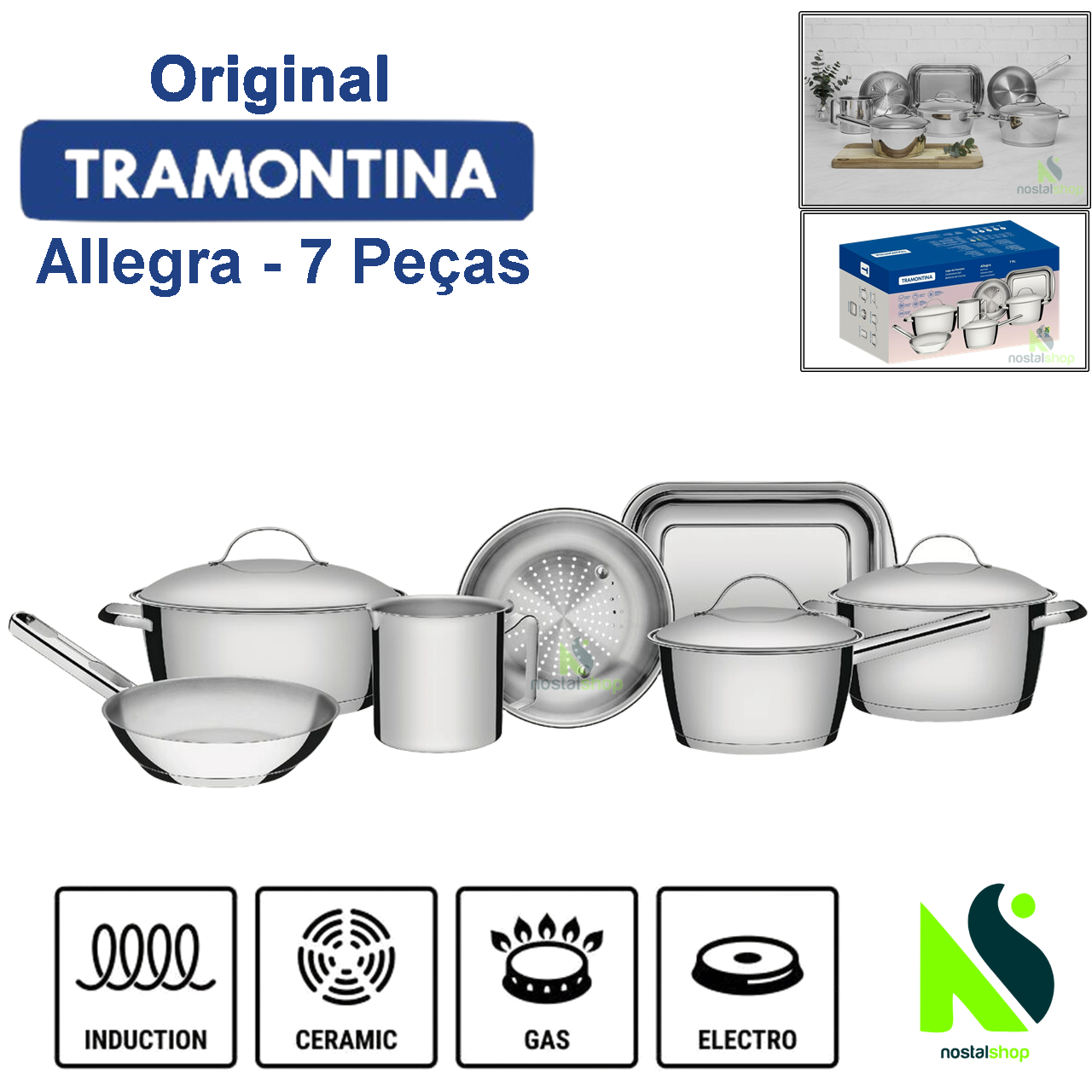 O Jogo de Panelas Tramontina Solar Ou Allegra em Aço Inox com Fundo Triplo é durável, prático e elegante. Produzido em aço inox, não solta resíduos e mantém os alimentos saudáveis. O fundo triplo (aço inox + alumínio + aço inox) garante cozimento rápido, uniforme e economia de energia. Pode ser usado em qualquer tipo de fogão e no forno até 260°C. Possui tampas com encaixe perfeito e saída de vapor, além de acabamento em alto brilho. É fácil de limpar, compatível com lava-louças e mantém o brilho por mais tempo.